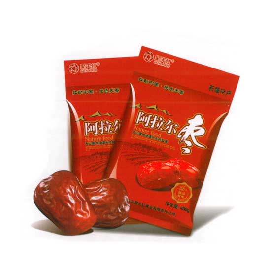 Displayed is a bag of gray date originated from the Alar region in Xinjiang province. Professionally cultivated, the date has a rich taste and pleasant sweetness. This high quality gray date is a healthy snack of all times.