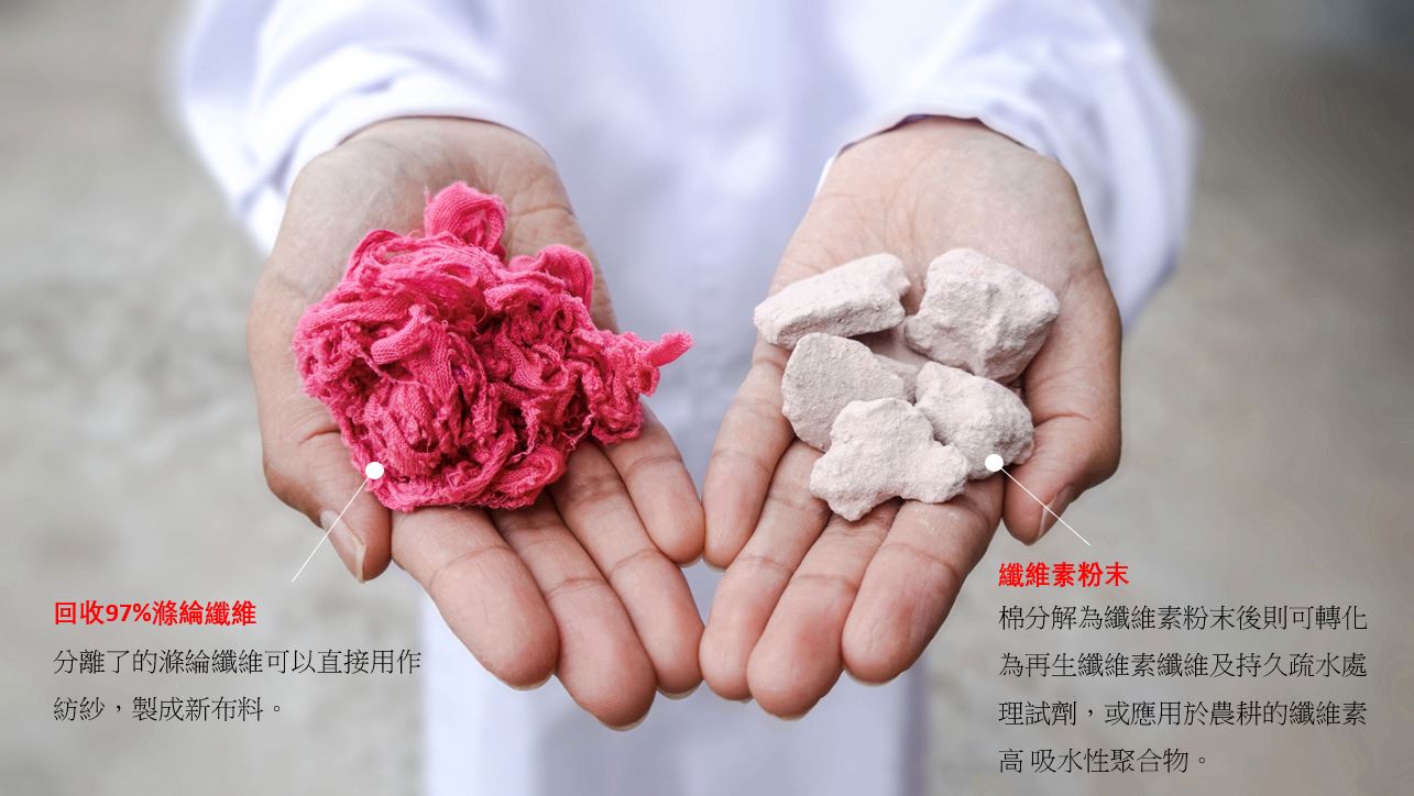 這個水熱反應過程只需用熱能、水和少於15% 的環保化合物,就可於兩小時內回收超過97% 的滌綸纖維,用來重新紡紗,形成纖維迴圈再用過程。
