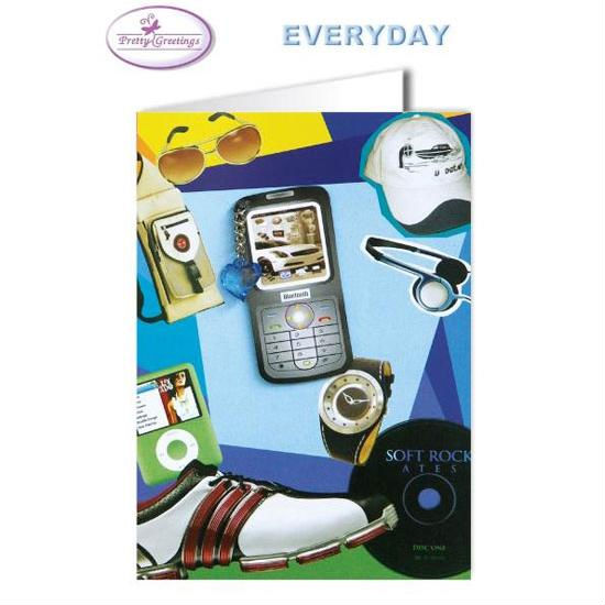 It doesn’t require a reason to send your loved ones a greeting card. This everyday card is designed with colorful daily life items like cell phone, cap and sunglasses. This card will be a good choice for sending a heart warming message to guys in your life.