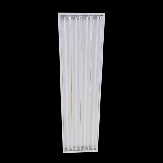 This displayed grid lamp features a rectangular shape design. It is fitted with 4 fluorescent tubes. This presented grid lamp is ideal for office use.