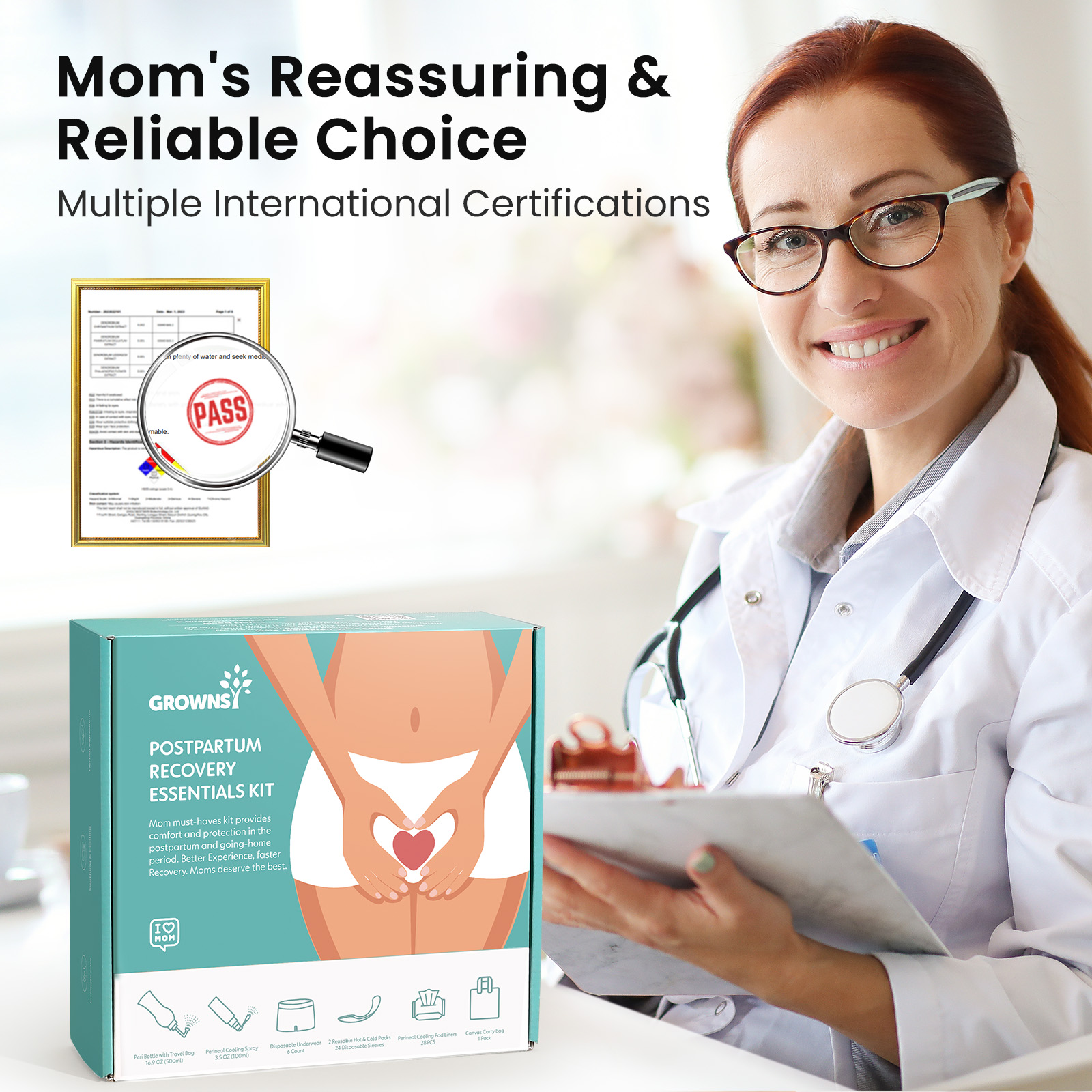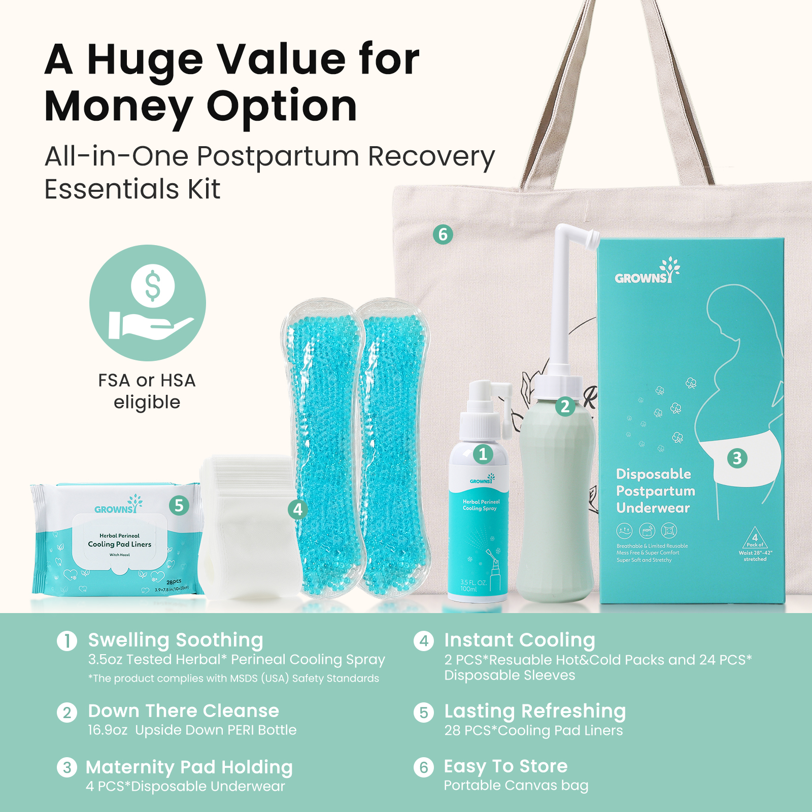 𝗠𝗼𝗺'𝘀 𝗘𝘀𝘀𝗲𝗻𝘁𝗶𝗮𝗹𝘀 𝗙𝗼𝗿 𝗙𝗮𝘀𝘁 𝗥𝗲𝗰𝗼𝘃𝗲𝗿𝘆:Grownsy postpartum kit has everything you need for postpartum recovery, meeting all your recovery needs with just one kit.The postpartum essentials kit includes 1) a 17oz/500ml PERI bottle, 2) 3.5 oz/100ml herbal cooling spray, 3) herbal cooling pad liners 28pcs, 4) 2 x perineal hot and cold packs with 24 disposable sleeves, 5) 4 x disposable underwear, 6) a canvas bag.