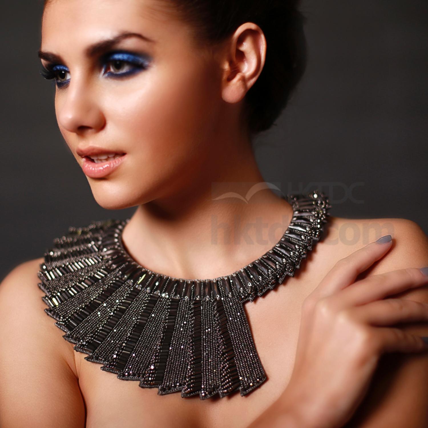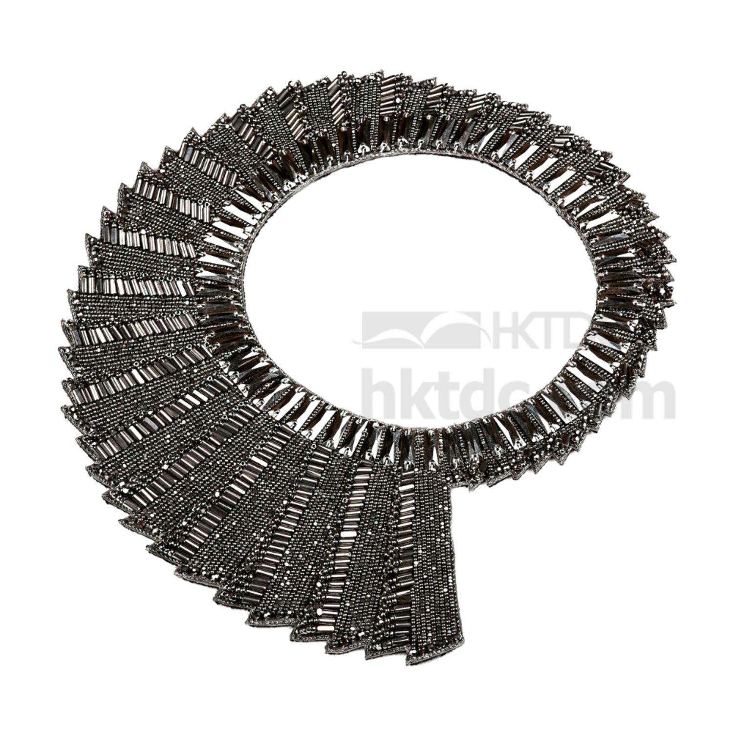 Begada's Signature design revolving neckpiece features gunmetal sewed on crystal tubes finely arranged with shiny charlotte beads, which are finely stitched to perfection on a faux leather with a fine felt backing and an invisible magnetic lock.
