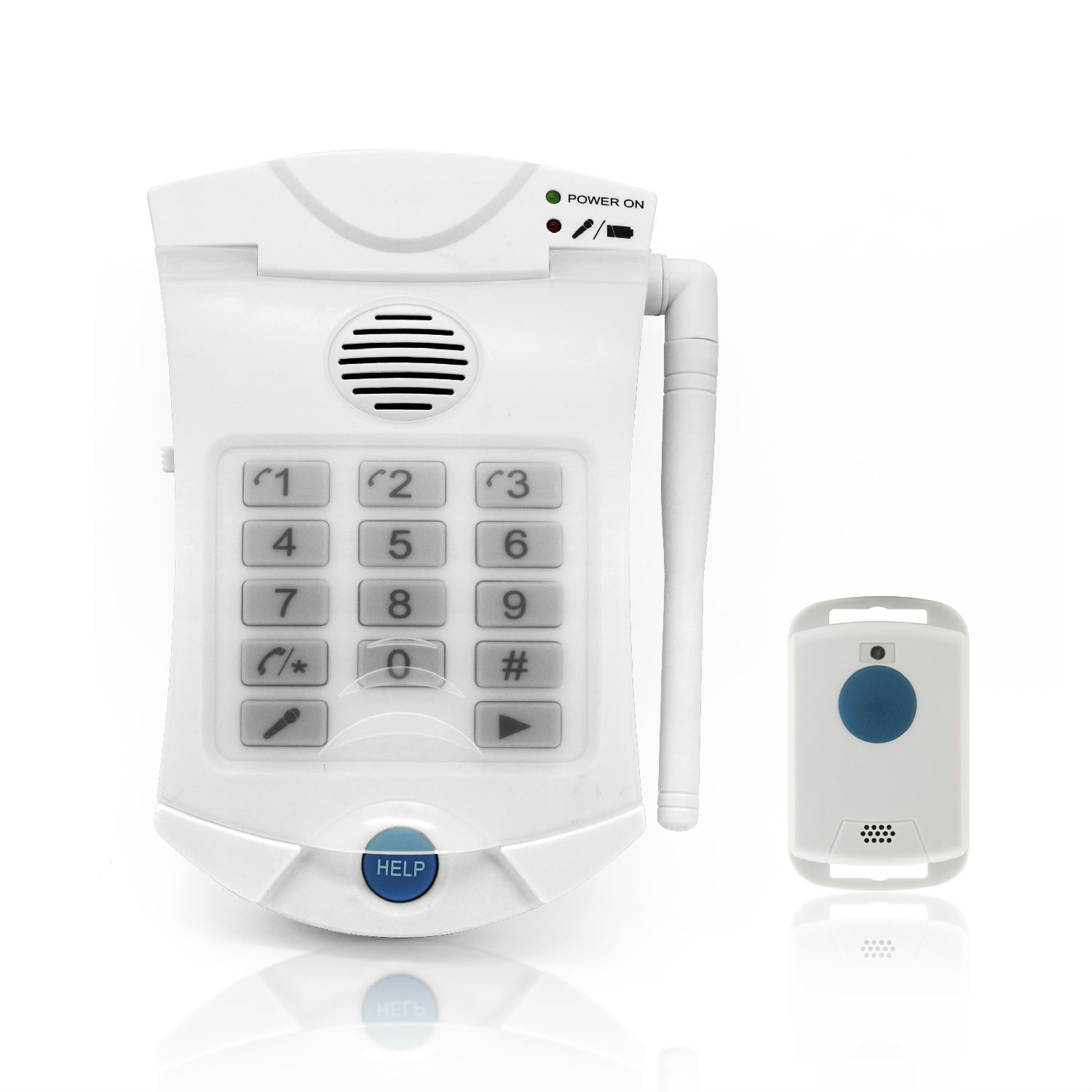 - Full 2-way communication through the pendant or the main unit - Panic pandant is rechargeable with USB cable - Range between the panic button and main unit is up to 50 meters - Powerful hand free speaker phone