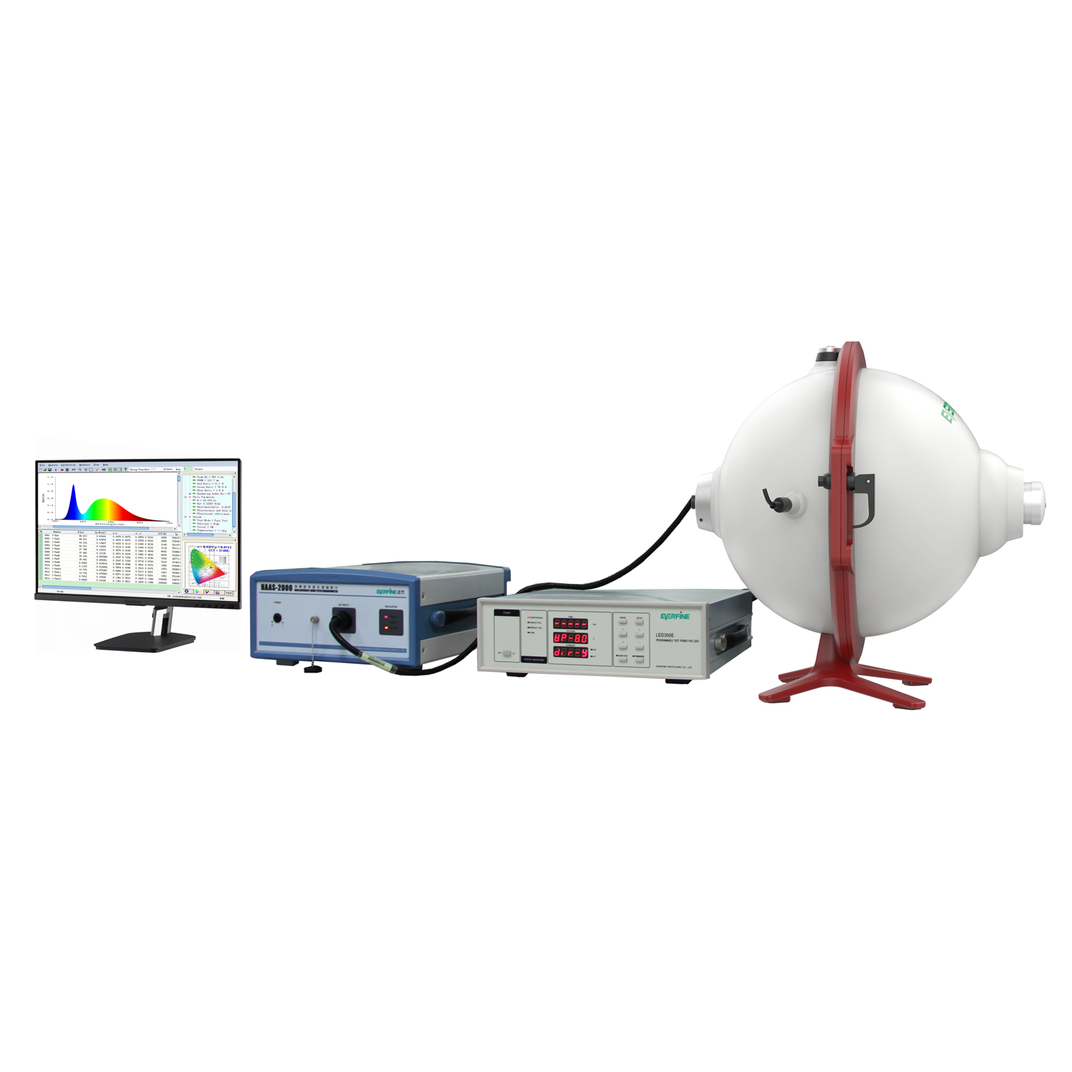 The system can test Luminous Flux, Luminous efficacy, P( λ ),Chromaticity Coordinate, Correlated Color Temperature, Color Rendering Index, SDCM, Dominant Wavelength, FWHM, electrical characteristics and etc.