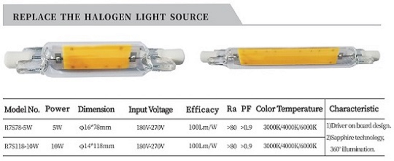 | R7S78-5W | 5W | φ16*78mm | 180V-270V | 100Lm/W | >80 | >0.9 | 3000K/4000K/6000K | 1)Driver on board design. 2)Sapphire technology, 360° illumination. |