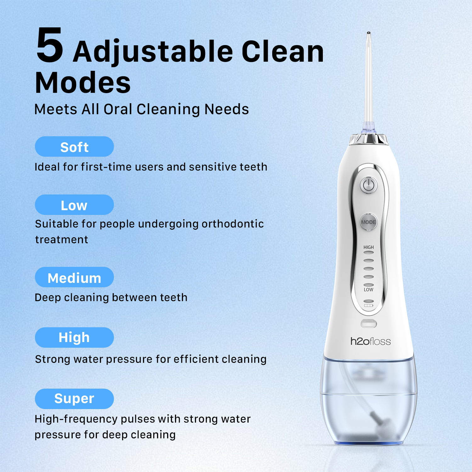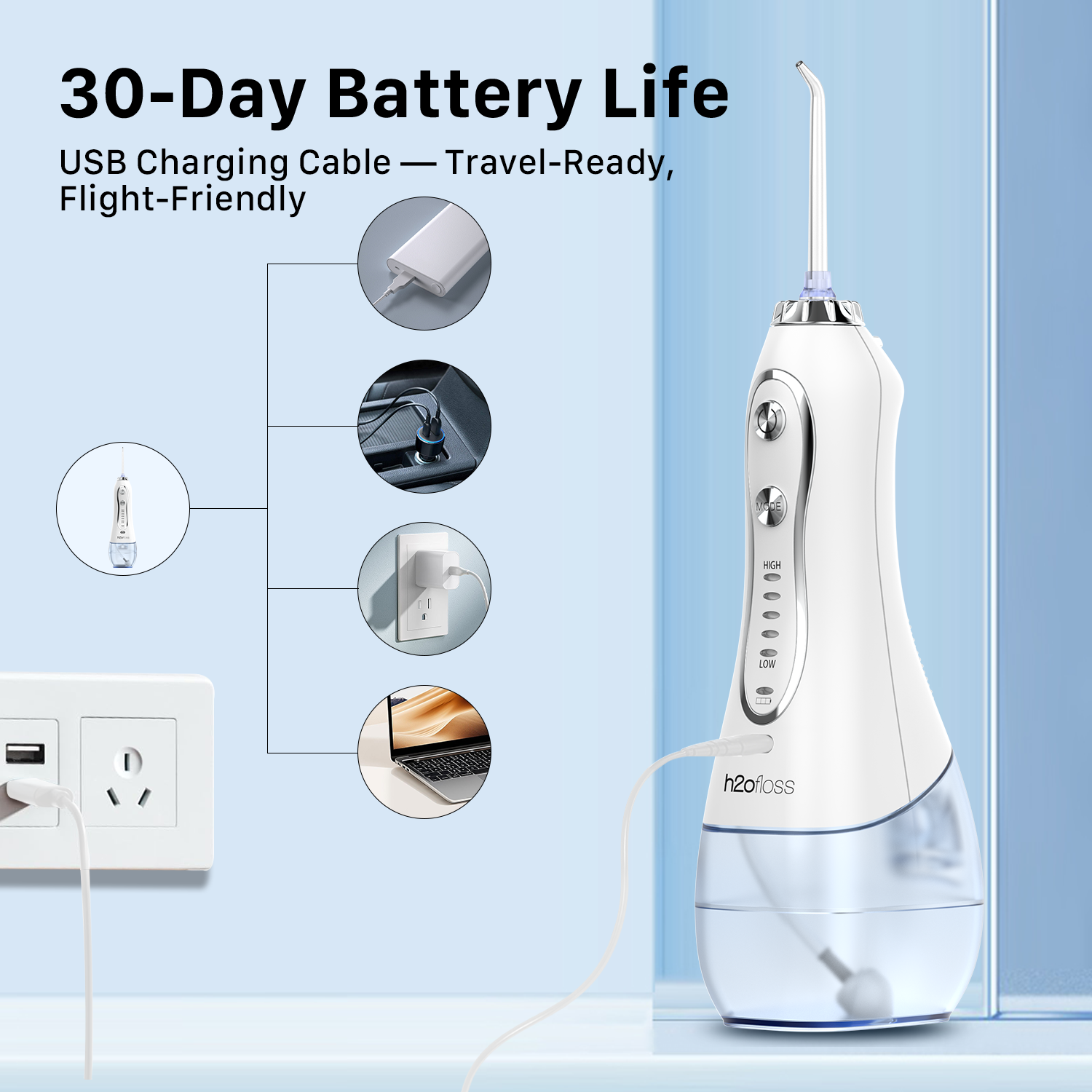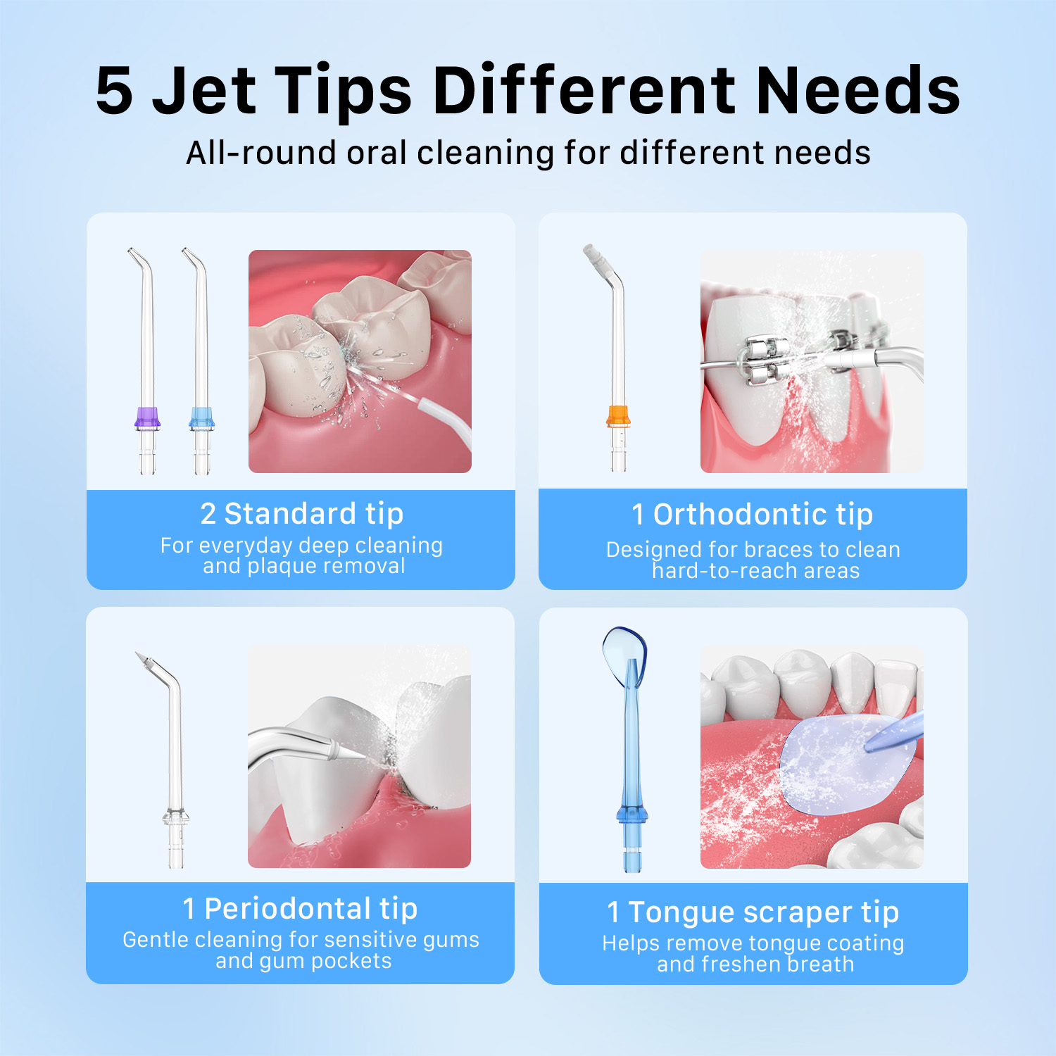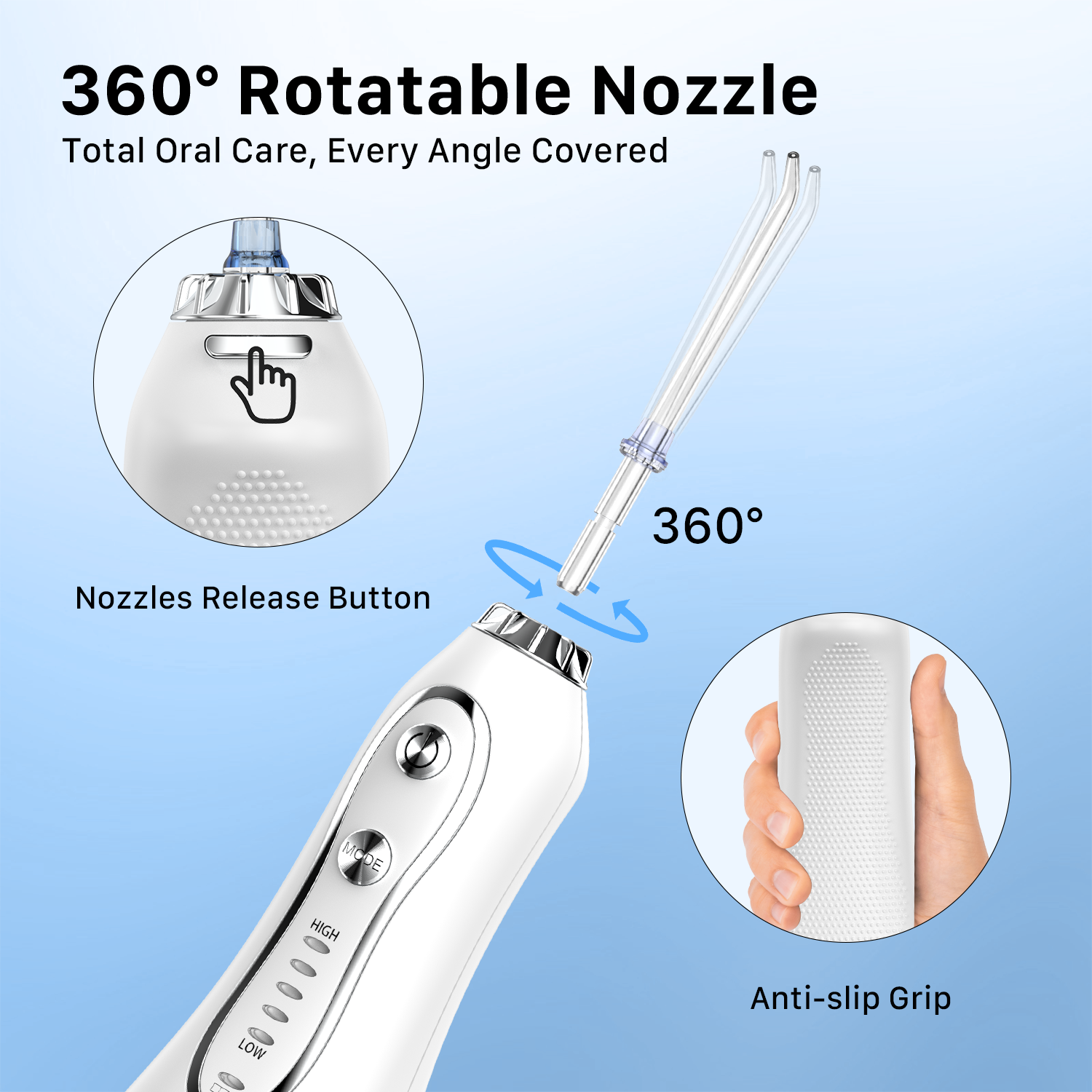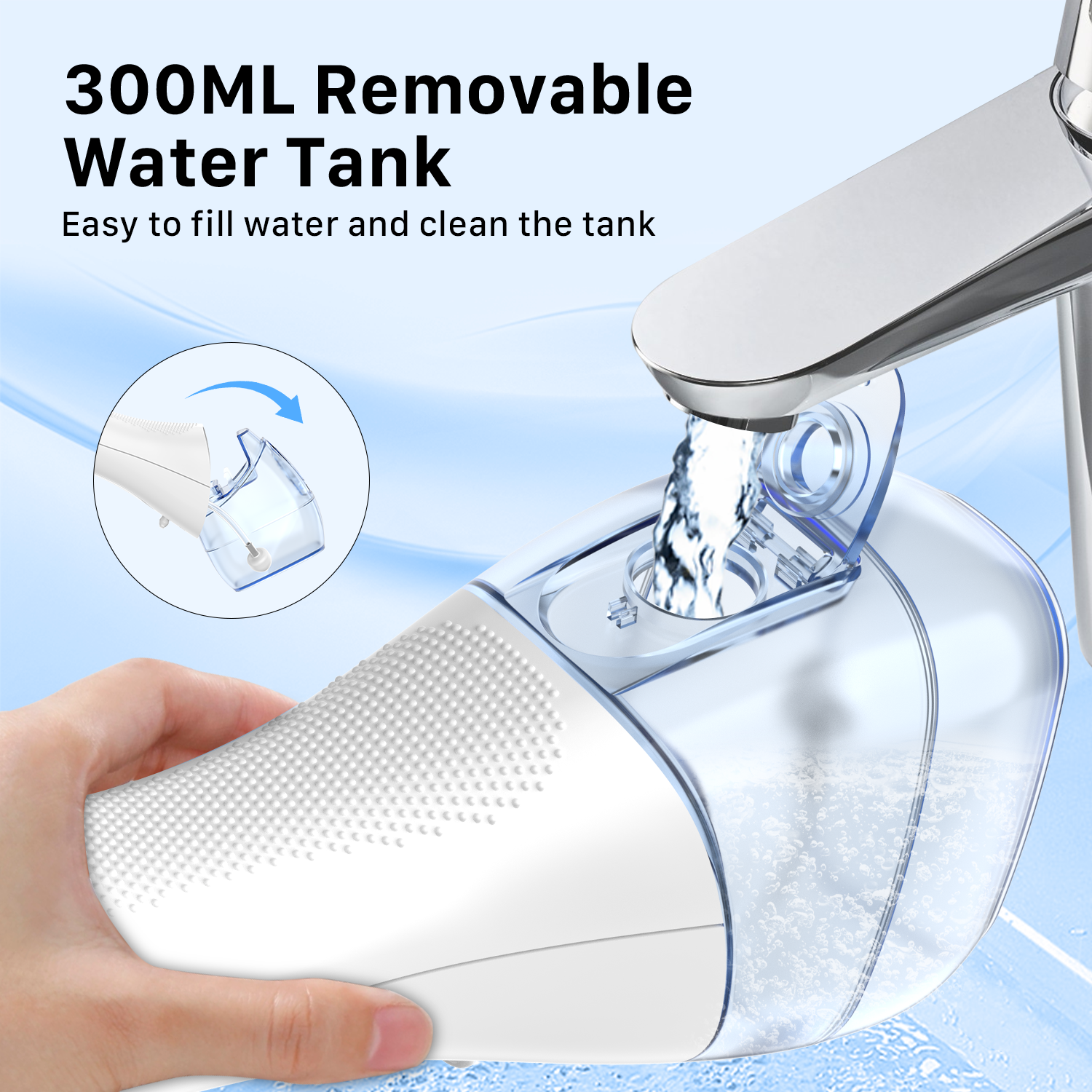 This water flosser features a 300ml large-capacity water tank, allowing a full clean in one use, and a built-in 2500mAh battery that supports 20–30 days of use on a single charge. Its low-frequency, high-water-flow design helps protect gums while providing a comfortable experience, and five pressure modes meet the needs of different users. With an IPX7 waterproof design, the water pump, motor, circuit board, and battery are separated into independent units to enhance overall waterproof performance. The patented gravity ball design allows cleaning from any angle, ensuring thorough, no-dead-angle oral care.