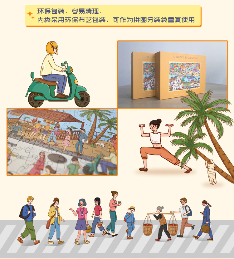 The morning work picture borrows the background structure of "Riverside Picture during Qingming Festival". It integrates the life elements of contemporary young people and vividly shows the living situation of contemporary young people. In the picture, you can see different professional characters busy in the morning full of vitality. Shuttle through the ancient and modern, pay tribute to the classics.