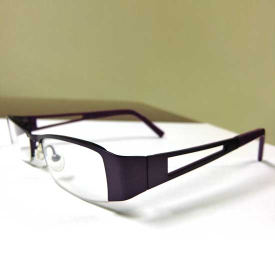 This pair of half-rim eyeglasses features a dark purple hued bar and dark purple hued temples for an elegant touch. Each temple comes with a trapezoid cutout for a vivid accent. These fashionable eyeglasses are a great choice for daily wear.