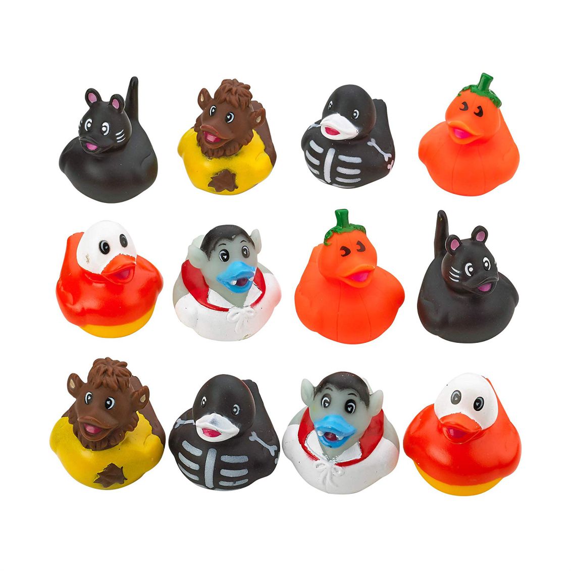 REAL DEAL – A package that includes 12 pieces of 2-inch cute ducklings - stylized ducks with a flat base, solid body, and beak. It has different characters including pumpkin, ghost, black cat, skeleton, werewolf, and vampire. It makes every bathing hour more fun and exciting!