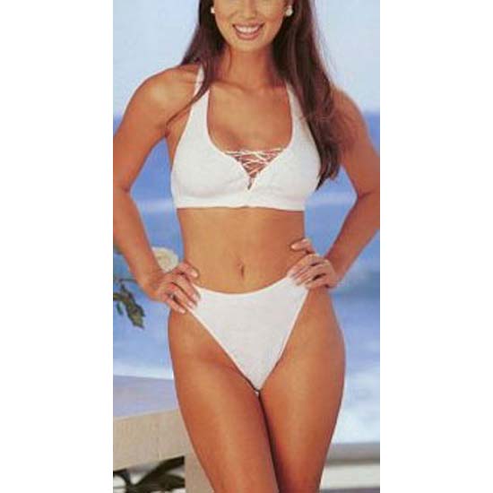 This is a set of halter-neck bikini coming with a deep-cut top. The slim lace at the neck makes the design sexy for ladies. The bright-white color goes well with tanned skin to exude exceptional charm on the beach.