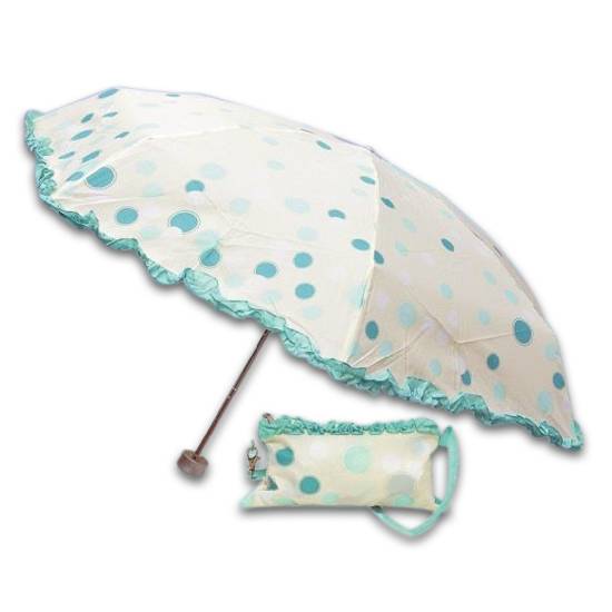This is a hand carry umbrella with dotted patterns. It is so handy and cute that is suitable for ladies. It has a umbrella bag attached, which is also dotted. Its colors and printing are customized.