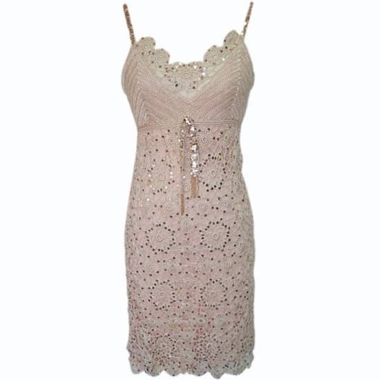 This knee-length dress flaunts an embroidered V-neckline with seductive spaghetti straps, promising you to be the center of attention in the summer. The sparkling sequins and lovable beads act as the icing on the cake on the delicately hand-crocheted dress. This sophisticated dress is a piece of perfect apparel for work and semi-formal occasions.