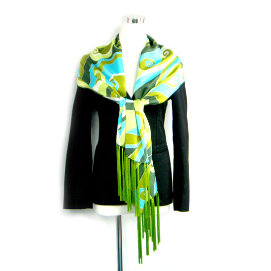 This fancy ladies' satin silk Batik shawl is designed with bright hand drawn patterns in oceanic blue and grass green. Long green tassels further highlight the natural charm of this accessory. It can be worn with a wide range of garments for various occasions.