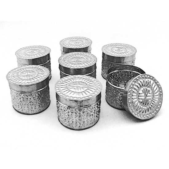 The candy box features a cylinder shape with a lidded closure. The box is fully accented with hand-hammered patterns for a beautiful finishing touch. Store candies in a stylish way with this aluminum candy box.