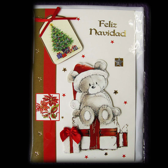 As shown is a printed greeting card boasting a joyful design. The cover features a cute teddy bear sitting on gifts. This adorable card is perfect for you to express your greetings.