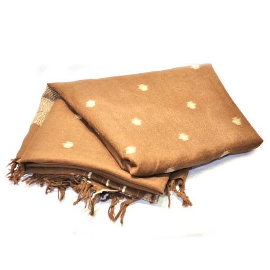 This woolen scarf is completely hand-woven. The light brown color adds an elegant touch to it. Some tassels are attached to the ends of the scarf, spicing up the plain design. Wear this pretty scarf to show your great sense of fashion.