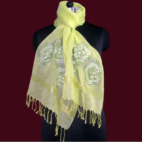 This is a hand-woven scarf with a dainty and deluxe appearance in light yellow. It is meticulously crafted with Lurex yarn, bead and sequence embroidery in flower shapes. This trendy scarf surely is a great addition to your fashionable wardrobe.