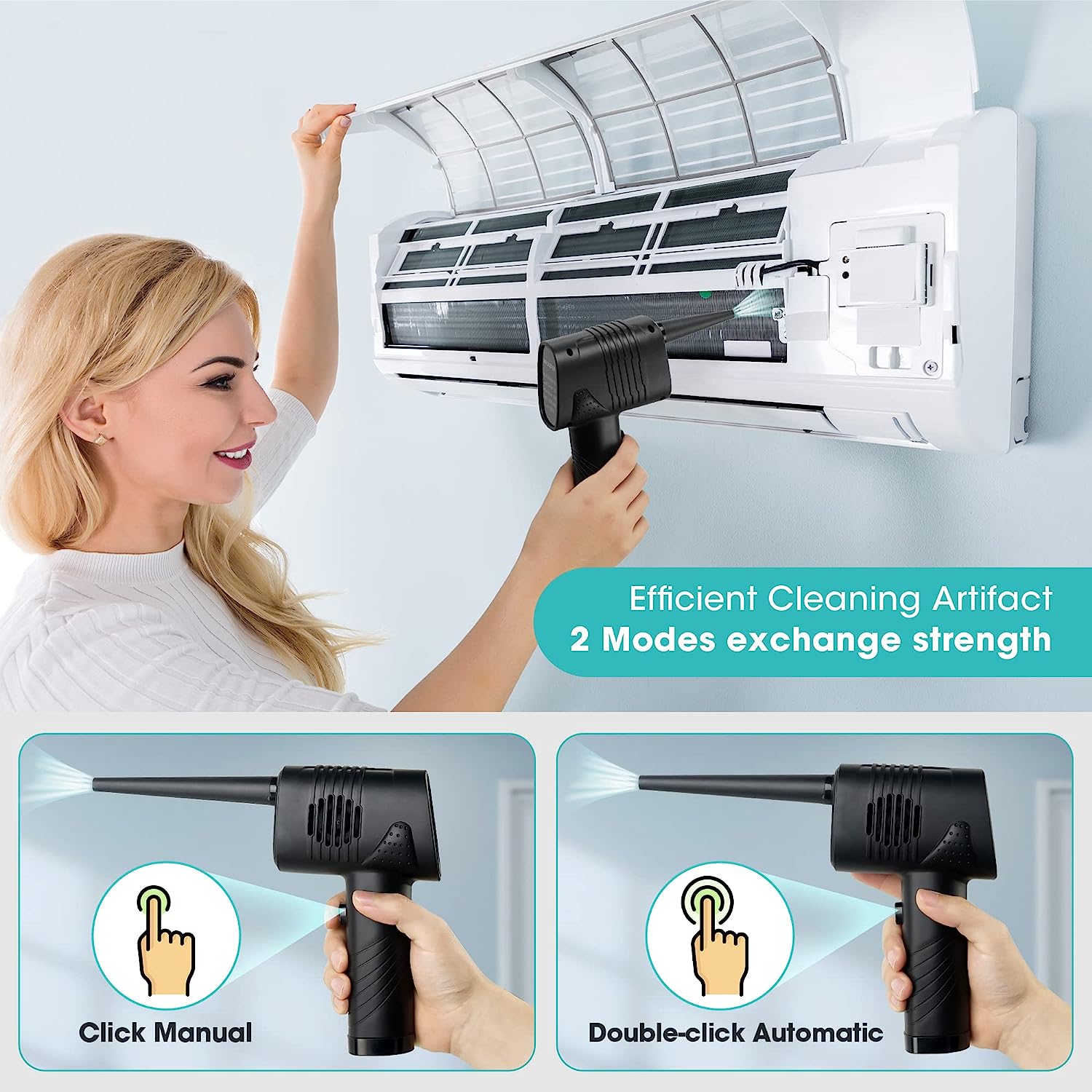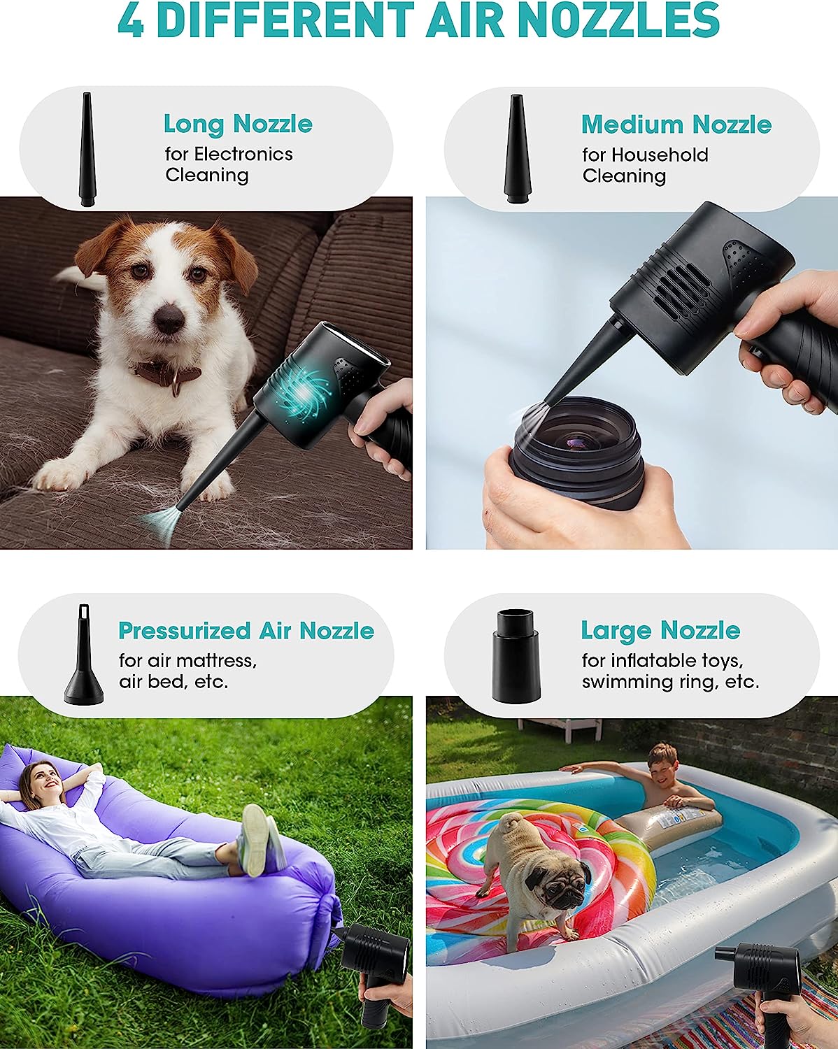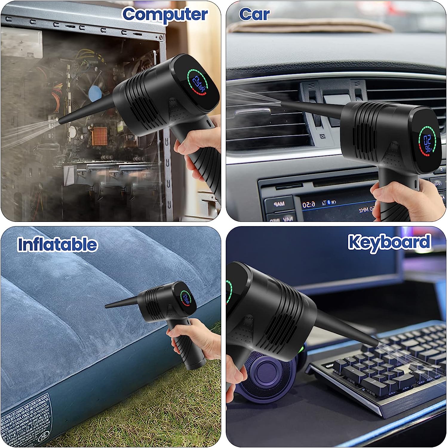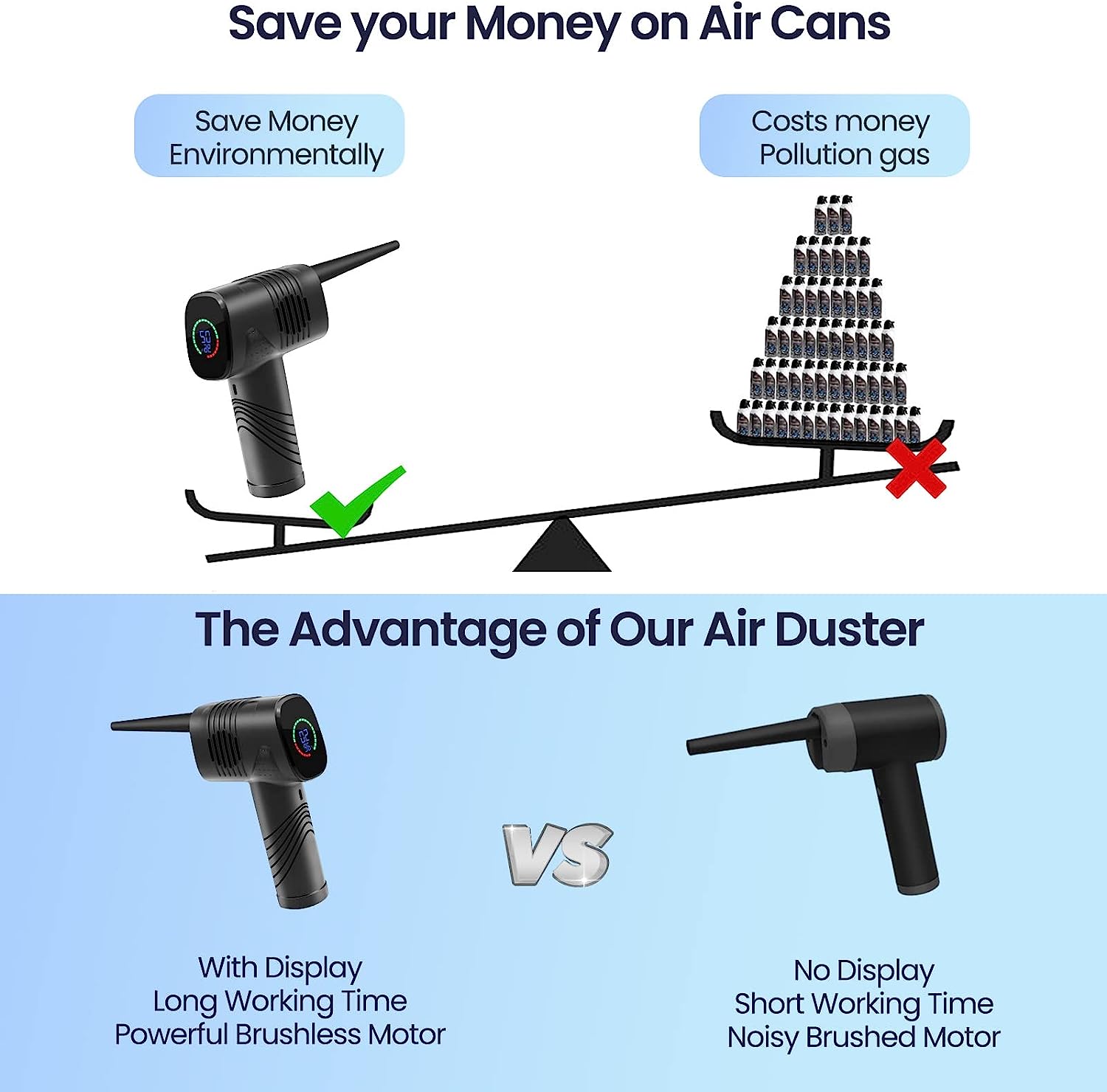 Air dusters【LED Lights & Eco-Friendly & Energy-Efficient】: Alternative to canned air Compressed Air can be recharged and used repeatedly. There are LED lights allowing you to easily clean up dark corners, bringing great convenience to your cleaning. No liquid or ice formation occurs during cleaning. It protects your electronics from liquids, so air dusters is Eco-Friendly & Energy-Efficient.
