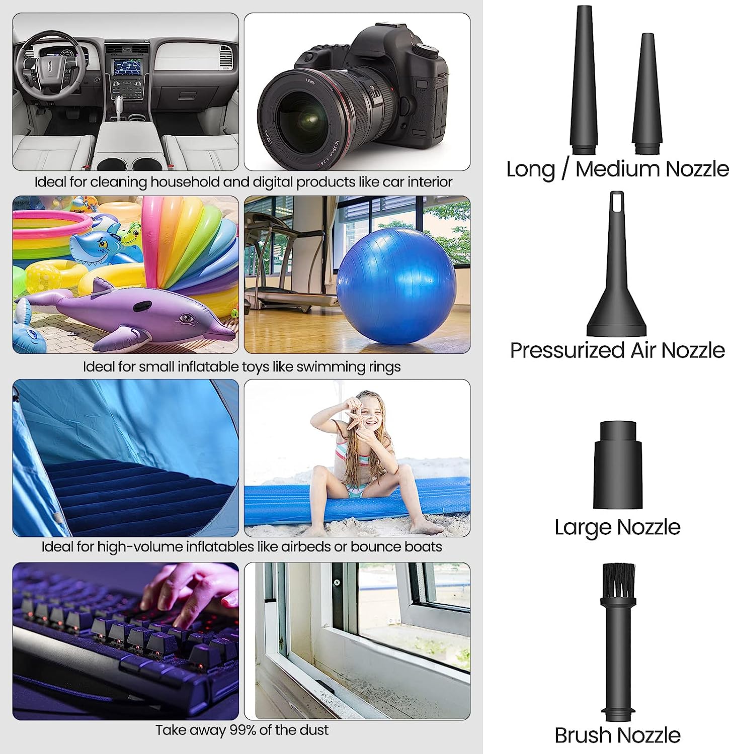 Compressed air duster【Multi-use & Easy to Carry】: You can have 4 nozzles, 1 cleaning brushes for multi-scene cleaning. Multi-use to lots of places.Suitable for dust removal of computer cases, keyboards, cars, fans, lily windows, etc.