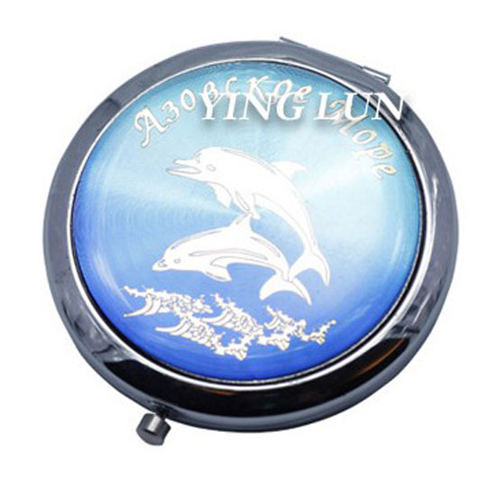 Presented is a handheld mirror coming in a handy round shape. Its cover is patterned with lovely dolphin imagery and text. This piece fits your hands, handbag or pocket perfectly.
