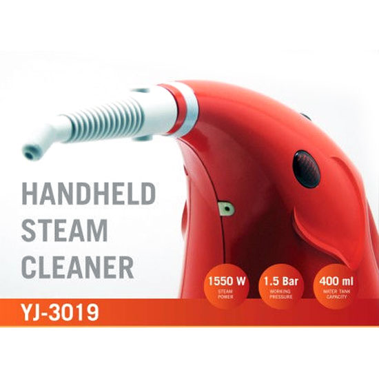 Pictured is a handheld steam cleaner with a water tank capacity of 450cc. The lightweight yet durable design adds user friendliness. This handheld steam cleaner cleans hard-to-reach areas easily.