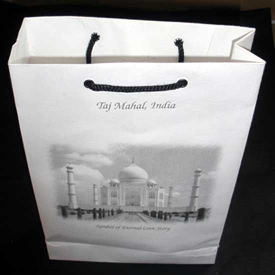 Highlighted here is a paper bag that is well made by hands. It is well accented with a picture of Taj Mahal to showcase a sense of elegance. This paper bag comes with a pair of black cotton strings for a refined touch.