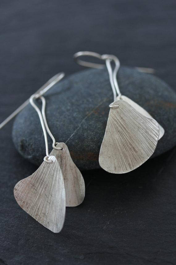 We made these earrings by cutting thin silver sheet into leaf shapes that were treated with narrow side of the pen hammer in order to create streak pattern that give the idea of leaf venation. The leaves are shaped like ginkgo tree, the oldest living tree species, that symbolizes longevity.