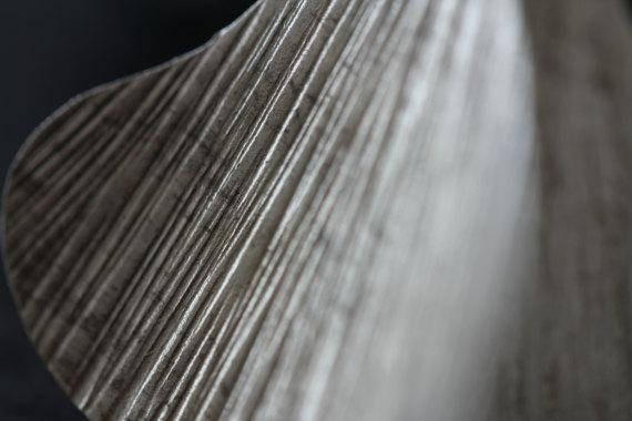 The two leaves are of different size (30x25mm the bigger one, 23x20mm smaller one) and are hanging from asymmetrically bent silver hook (25 mm long on on side and 30mm on another). Our logo "stories" was hand stamped on the back of the smaller leaf.