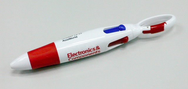 This ball pen is made of plastic and has a hanging part on top for holding lanyards or key rings. It offers 4 ink colors and can provide a smooth writing experience. The ball pen can be printed with logos and is excellent for school, office or promotional use.