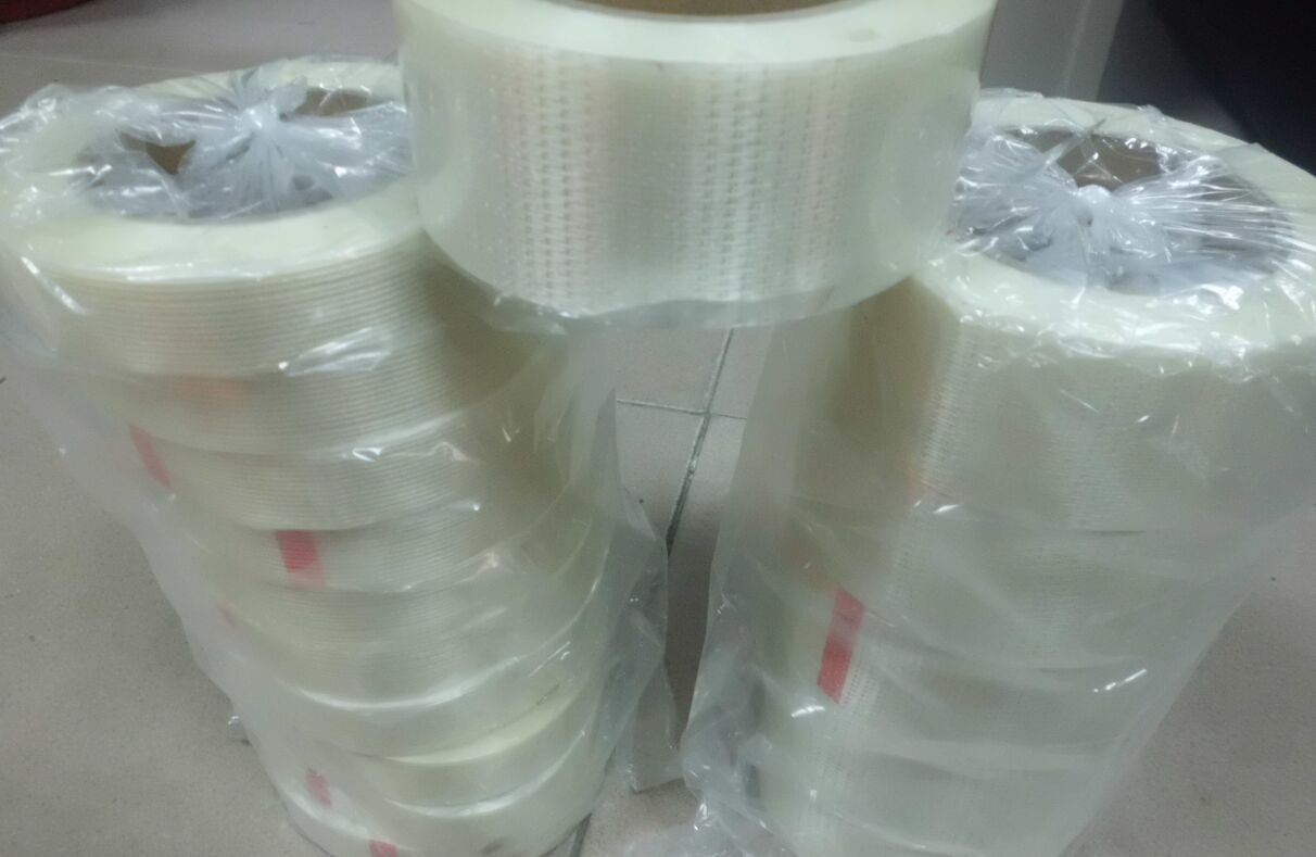 Hanging paper fiber tape lntroduction:hibh-strength glass fiber yarn or cloth for the strengthening of eomposite material composite polyester film (PET film) film,coated with a strong adhesive adhesive made of single-sided adhesive tape,high tensile strength with a high degree of Wear resistance and anti-moisture ability and superior tensile strength leaving no residue Tape according to the arrangement of glass fiber there are two types of words and cross.