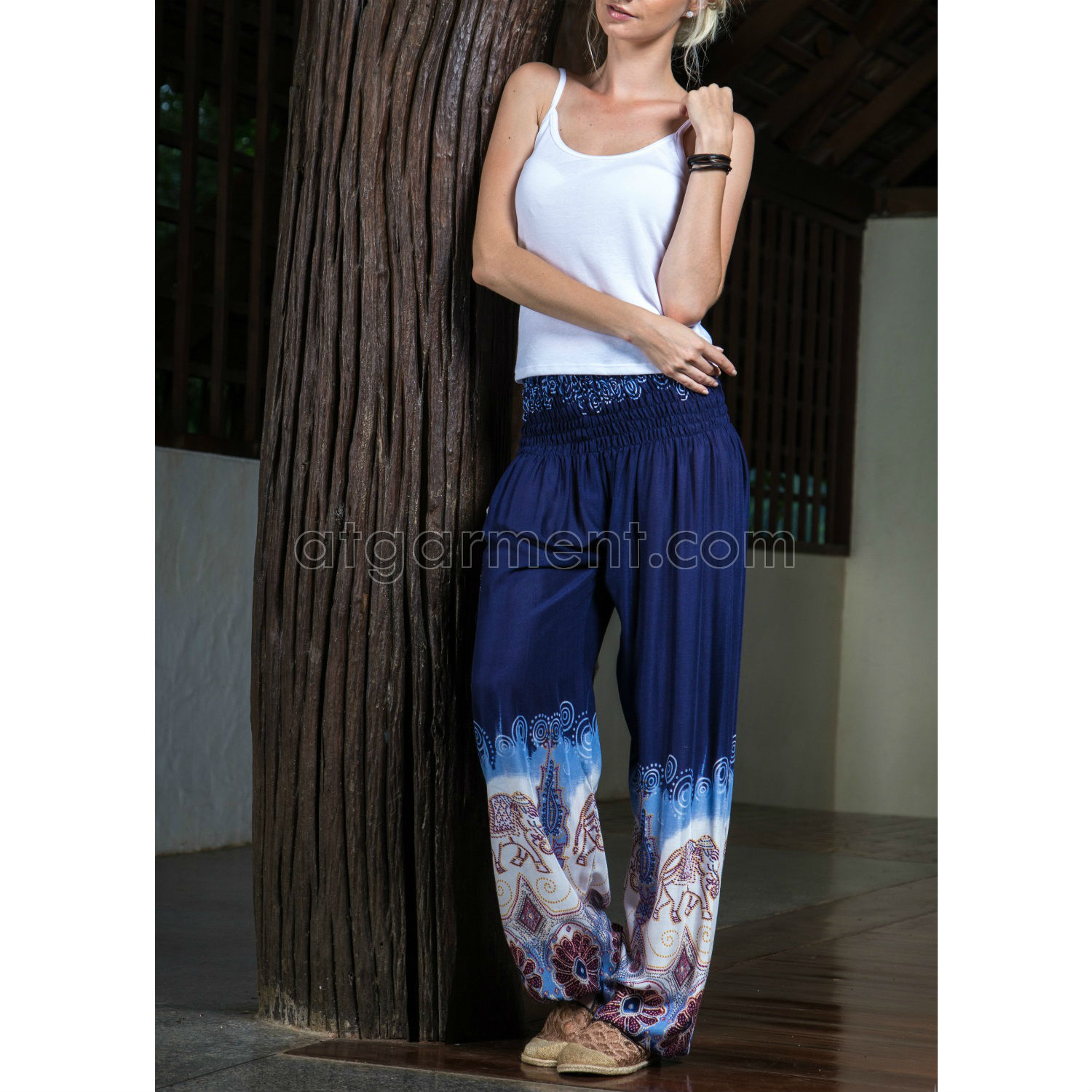 Perfectly encapsulating the essence of laidback appeal, this pair of harem pants invites you in for a full-day of relaxation. The full-length and draped silhouette of elastic waist finish wraps your legs in effortless manner and makes an ideal vacation piece with its breezy rayon tailor.