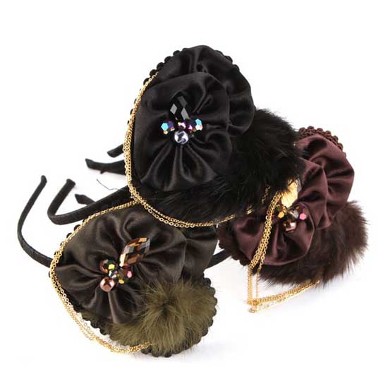 Presented here is a head band with a stylish and sophisticated design. The head band is adorned with oversize fabric-made ornaments with glittering beads, showcasing a sense of refinement. This head band is easy to mix and match.