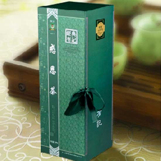 Displayed is a health tea that comes in an elegant green box tied with a ribbon. Carefully prepared, this tea has a refreshing and sweet taste. This tea is a good choice to be consumed everyday for the well being of your body.