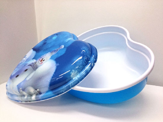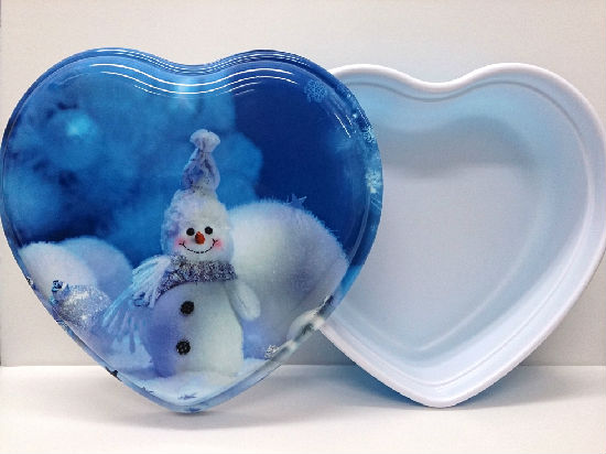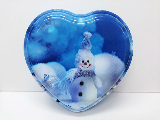 This appealing heart-shaped box is the perfect choice as a heart-warming food gift receptacle. Printed with state-of the-art thin plastic film printing and processing technology, the snowman picture atop the lid features high resolution. This nontoxic box meets food safety standard, so you can just place your freshly made cookies in it without worries.