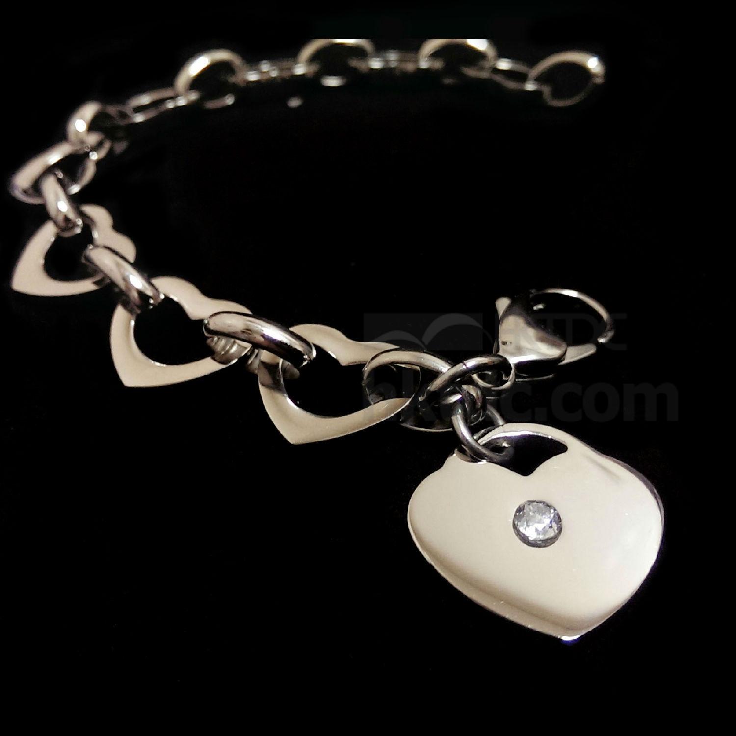 Assembled with heart-shaped links all along, this link bracelet is definitely a lovely version for spicing up any modern look. This bracelet underlines a heart lock charm with a white CZ stone accent at the center for a glitzy appeal. Closed with a standard lobster clasp, this polished wristwear allows for a quick fastening.