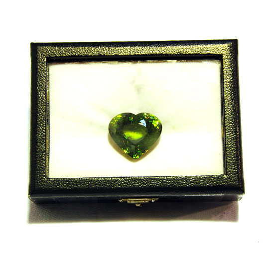 Featured here is a heart-shaped sphene stone in a lively deep green color. The brilliant-cut sphene stone showcases unique color shades and intensive fire. The glamorous sphene stone is perfect material for a necklace pendant.