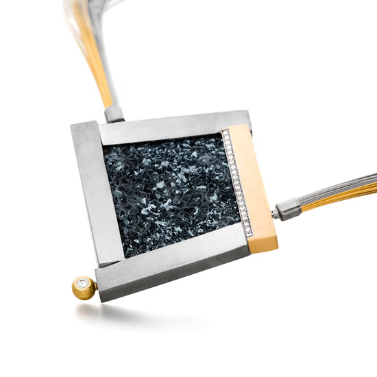 This necklace features a square-shaped pendant encrusted with diamonds and hematite crystals with an opulent surface. The pendant in platinum is brightened by the 18k yellow gold insert. With an interchangeable vario clasp, this necklace creates endless mixing-and-matching possibilities.