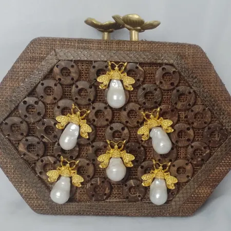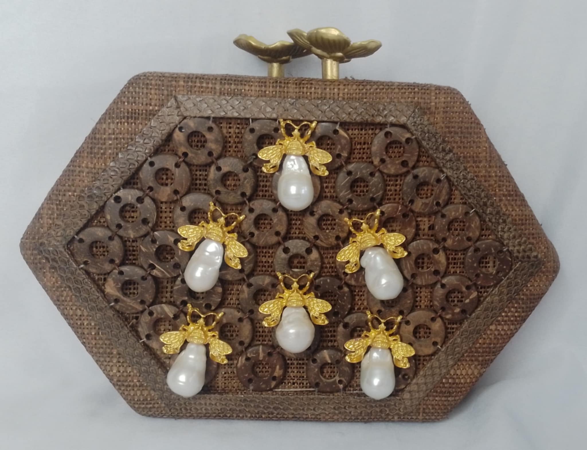 Handcrafted bag made of coconut shell and raffia with baroque pearls accent.
