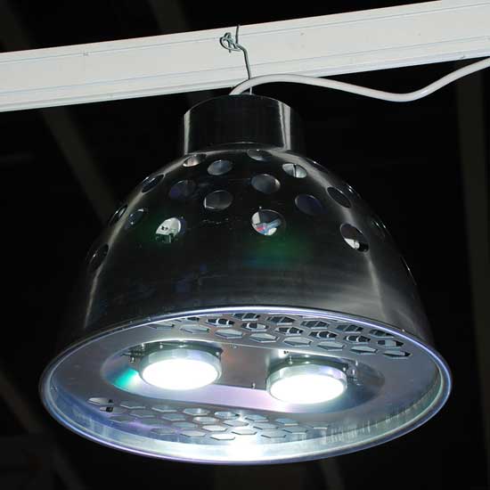 Displayed here is a high-bay light that is equipped with an LED light source. It is built to last for years. This LED high-bay light is excellent for factories, supermarkets, storehouses, etc.
