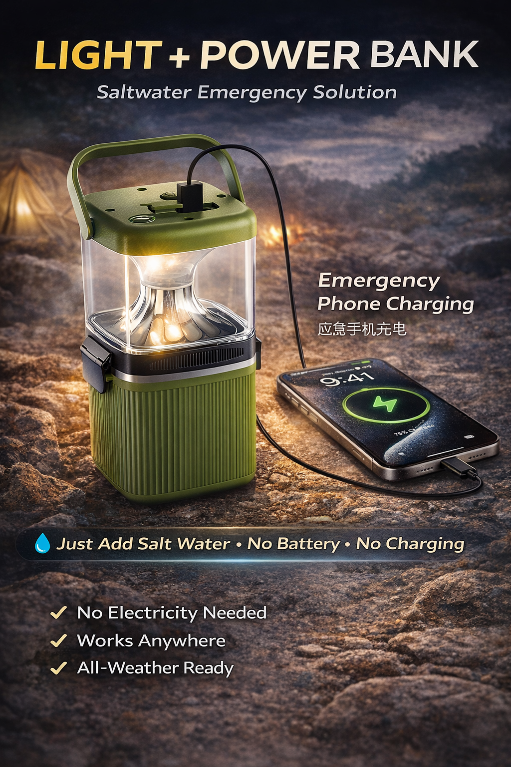 High-Capacity Multi-function Saltwater Camping Lantern - 200+ Hours Runtime with USB Mobile Charging Port
