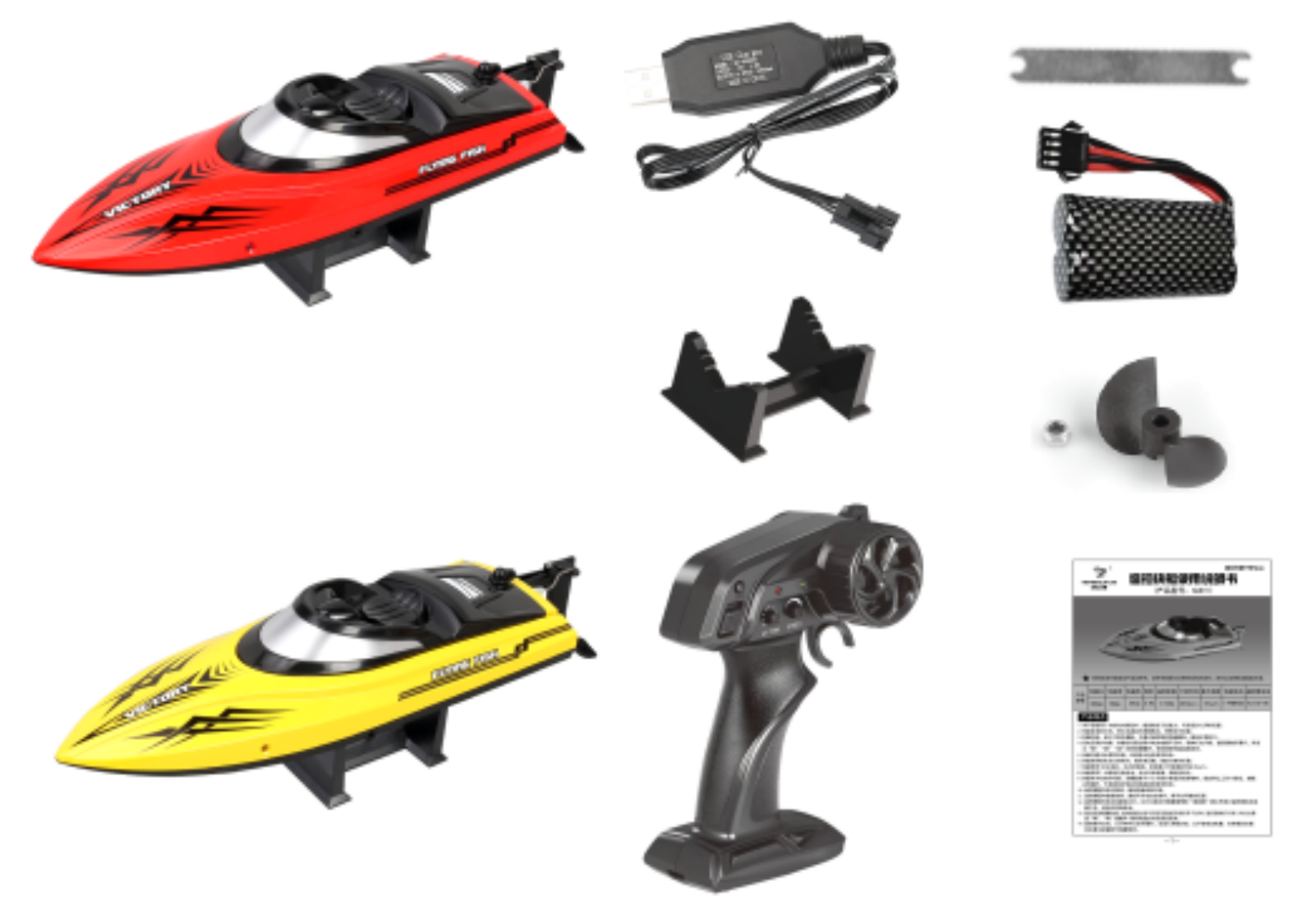 Accessory List: Speedboat *1, Remote Control *1, Li-ion Battery *1, USB Charger *1, Screwdriver + Hex Nut *1, Open-end Wrench *1, Display Stand *1, Instruction Manual *1
