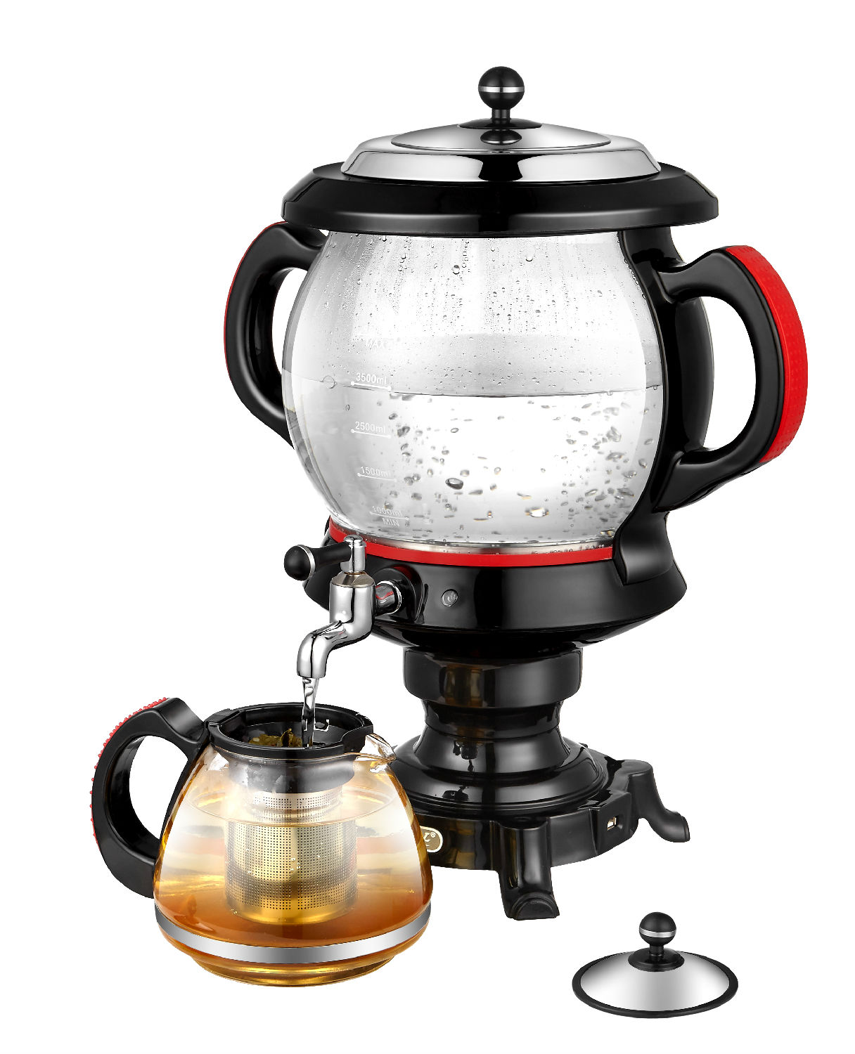 220-240V 1950-2300W 50/60Hz Concealed S/S heating element Keep warm and auto switch off functions Boil dry & overheat protections Boiling and keep warming indicators Unique metal faucet Elegant teapot Removable & washable S/S filter in the teapot