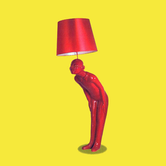 This decorative lamp in red features a bowing man base and a column shade. It is durably made to ensure long lasting performance. This attractive lamp is widely used in indoor areas.