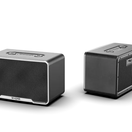 c. Visual details in convenient Cast-Aluminum handle, custom leather like enclosure, reimagined speaker grille.