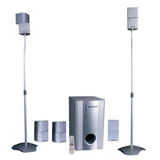 This is a set of 5.1 home theatre speakers with a remote control. Two of the five speakers come with a stand. The silver set allows you to enjoy a high-quality sound effect, which makes your home into a mini theatre.