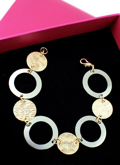 This splendid bracelet comes in a chain of alternate silvery hoops and circular charms. The hoops feature hollow areas and the circular charms highlight embossed details for added sophistication. The lobster clasp offers fast and easy closure for everyday wearing. Add a touch of glamour with this glittering bracelet.