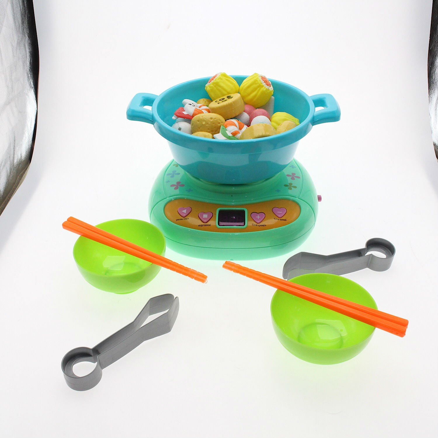 Rotating hot pot, control button,Toy food. With rice bowl and chopsticks