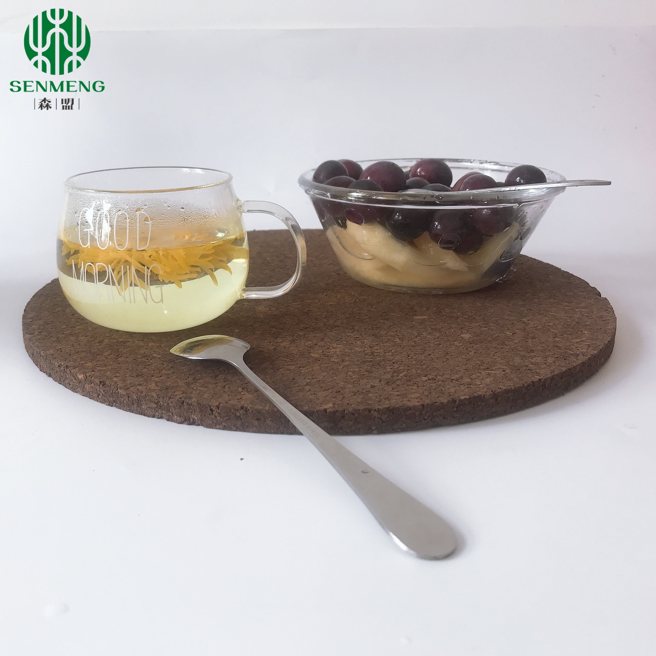 The round cork placemats, cork trivets are made of carbonized cork. It is eco-friendly, healthy, heat insulated, durability, recyclable, non-toxic. We can supply various sizes for your any requirement. Add a natural finish to your dining table with cork placemats. This round design makes a great place setting and will protect your table surface from marks and stains.
