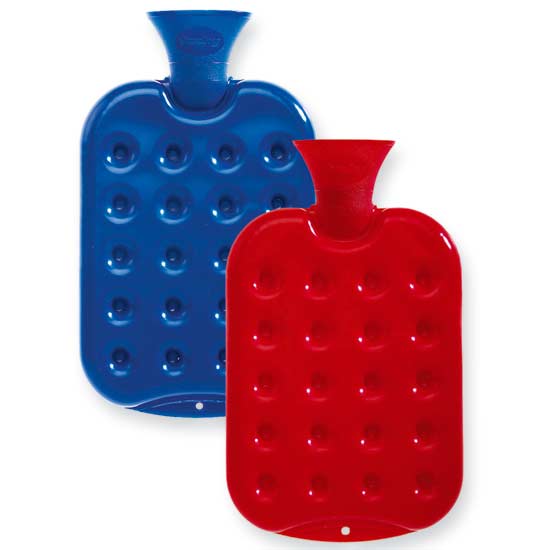 This hot water bottle features a rubber construction with embossed surfaces. It has a screw stopper for a reliable secure fit. This hot water bottle is the perfect treatment for aching muscles.