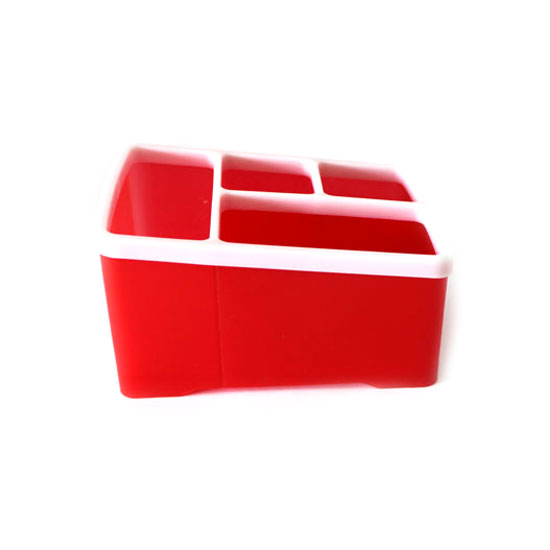 This is a red container with four compartments. It has a strong structure for long-lasting use. This container is a practical addition to your home.